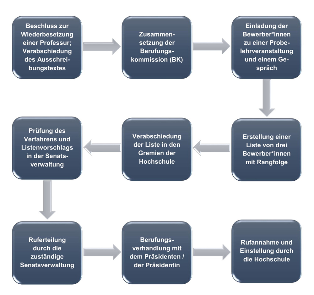 Professor*innen werden in Deutschland nicht eingestellt sondern berufen. Jeder Berufung geht in der Regel ein mehrstufiges Verfahren voraus, in dem eine Berufungskommission mehrere besonders geeignete Kandidat*innen ermittelt, die einen Platz auf der Berufungsliste erhalten. Nach einer Prüfung des Verfahrens durch die zuständige Senatsverwaltung wird die erstplatzierte Person berufen. Nimmt diese den Ruf nicht an, ergeht ein neuer Ruf an die zweitplatzierte Person usw. Ein Berufungsverfahren dauert ab der Ausschreibung in der überwiegenden Anzahl der Fälle mindestens 12 Monate, eher länger.